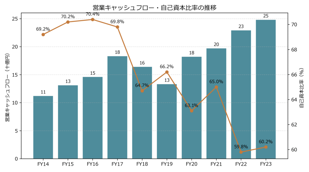 2024年3月期の自己資本比率は約59%、営業キャッシュフローは約284億円と安定黒字を継続。