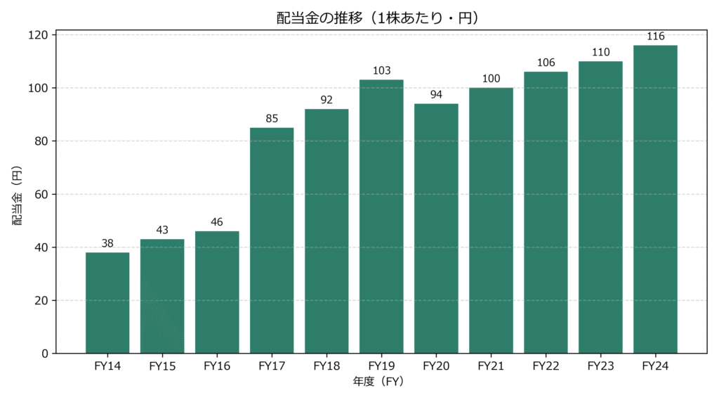 リーマンショック後の2009年に28円だった1株配当は、2024年には116円へと約4倍に。