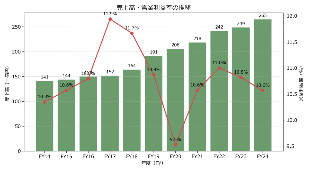 2014年から2024年にかけて、売上高は約1.4倍に拡大。