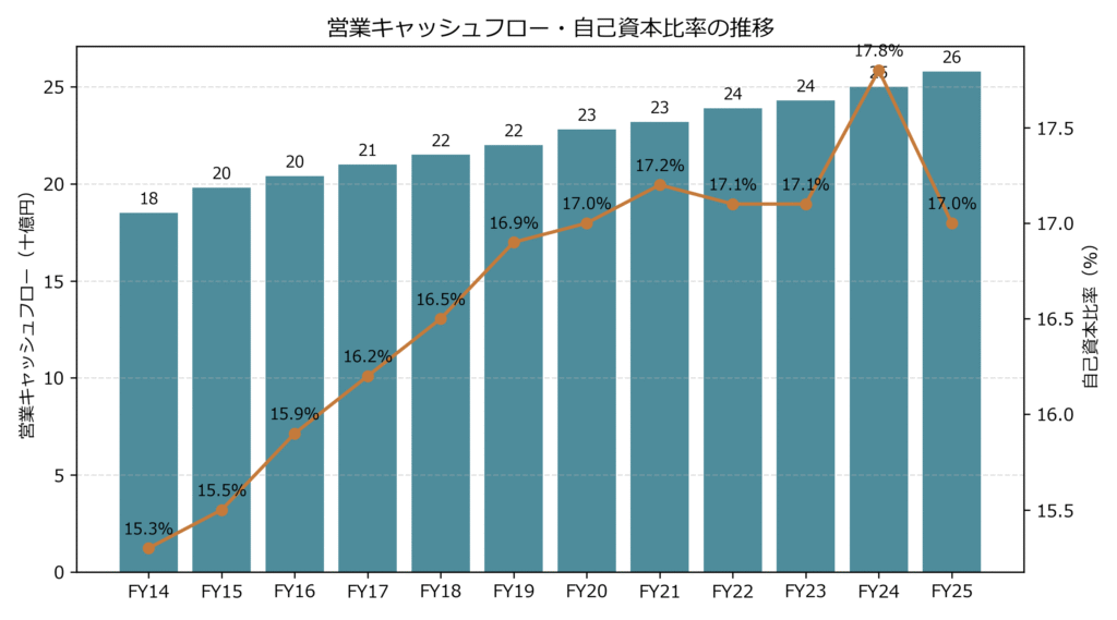 自己資本比率は2014年の15%台から2024年にかけて17〜18%へ上昇。