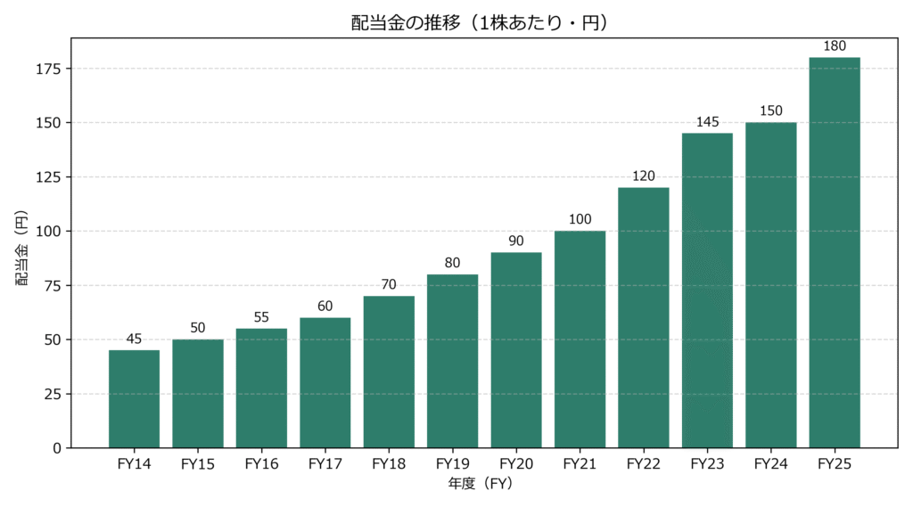 配当は2014年度の45円から2025年度予想の180円まで、約4倍に増加。