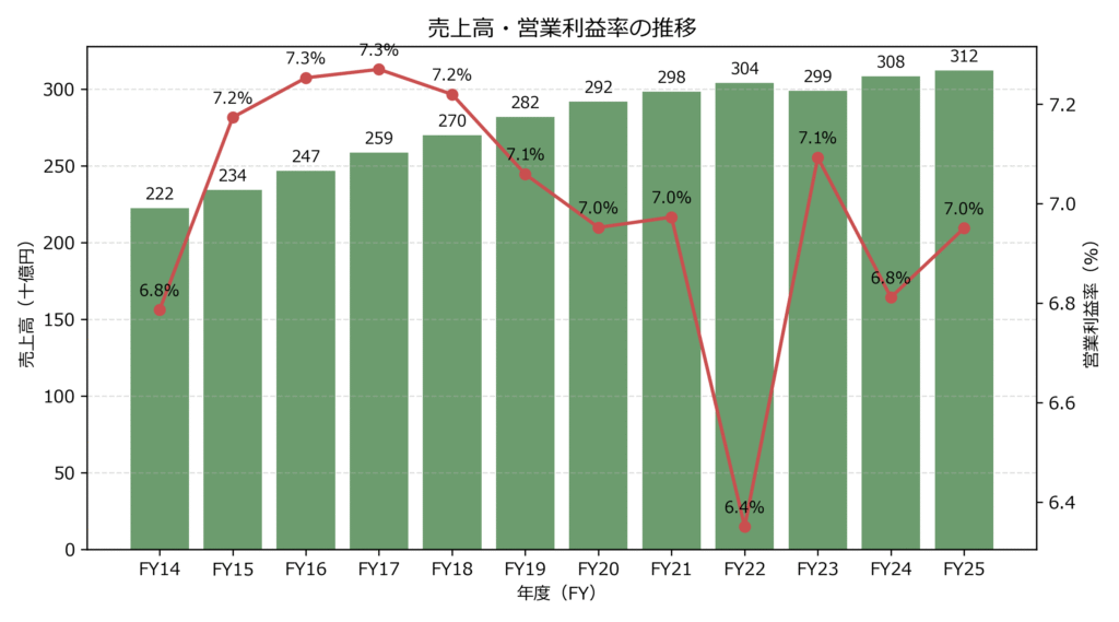 過去10年の売上高は2014年度の約2,225億円から2025年度見通しで約3,122億円まで着実に拡大。