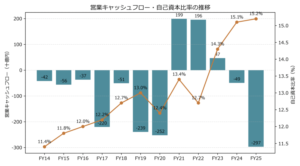 2025年3月期も営業CFは-2,968億円と大きなマイナスですが、