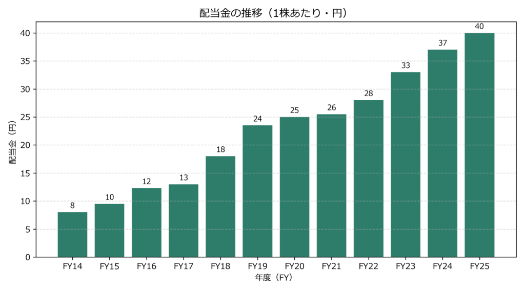 2014年の1株8円から2025年には40円へと5倍に増加。